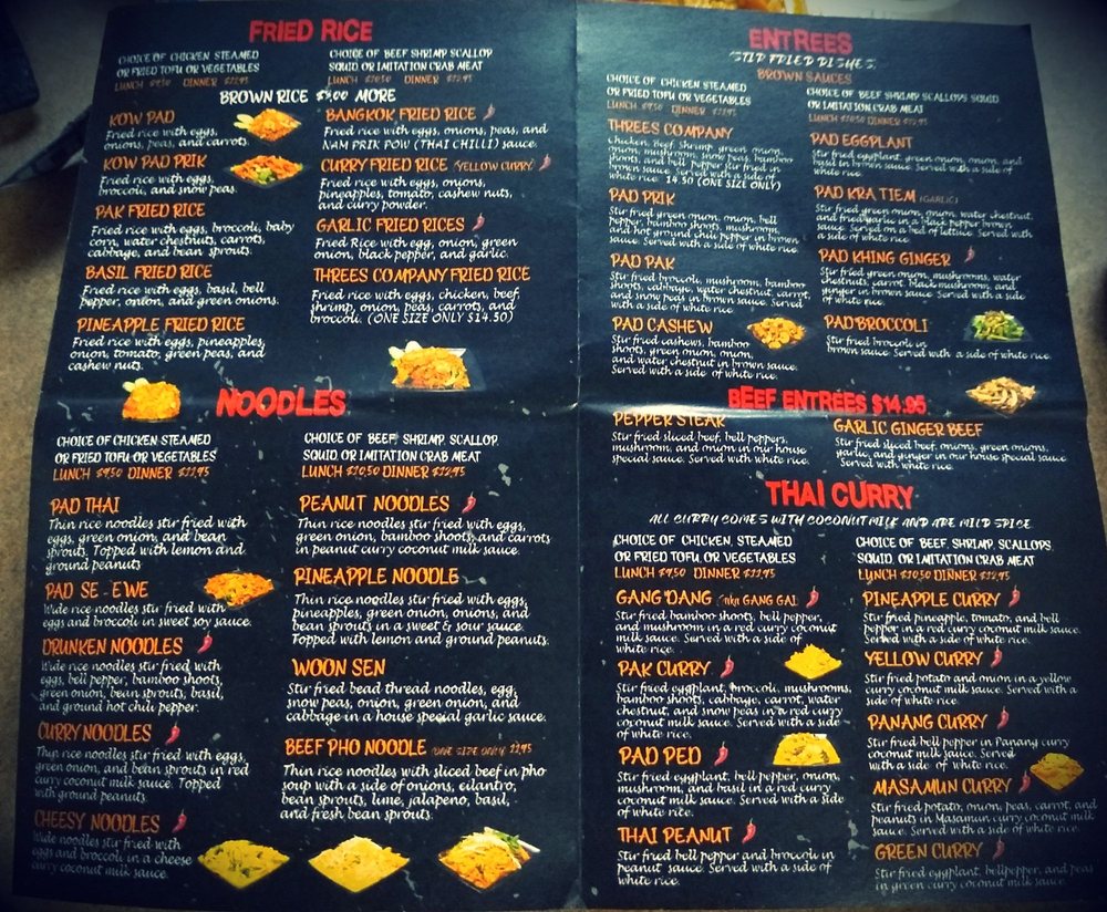 The menu shines with flavors, featuring standout dishes like Drunken Noodles and Pad Thai, both celebrated for their rich taste and generous portions. Customers rave about the Threes Company Entree, a delightful blend of chicken, beef, and shrimp in a savory brown sauce. For a refreshing start, the Ginger Salad adds a crisp, zesty touch.